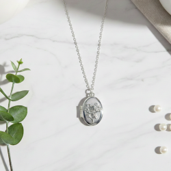 Łańcuszek z zawieszką w formie otwieranego medalionu w kształcie owalu, zdobiony eleganckim tłoczeniem w formie róży. Do jego wnętrza możesz schować zdjęcia ukochanej osoby, aby mieć je zawsze blisko siebie.