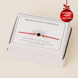 Bransoletka ochronna wykonana z czerwonego, woskowanego sznurka ze złotymi kuleczkami i czarnym turmalinem.