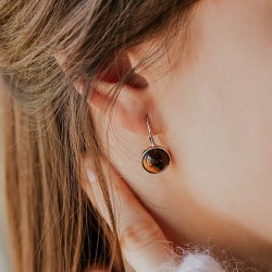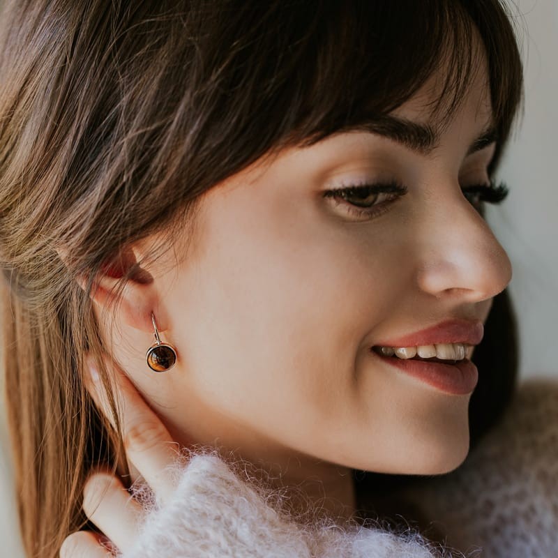Kolczyki wiszące wykonane ze srebra, w których osadzono naturalne tygrysie oko. Kamień w ciepłych, brązowo-złotych odcieniach pięknie mieni się w świetle, tworząc charakterystyczny „koci” refleks. Prosta, okrągła oprawa podkreśla naturalne piękno minerału i sprawia, że kolczyki są subtelne, a zarazem wyraziste – idealne zarówno na co dzień, jak i do eleganckich stylizacji.