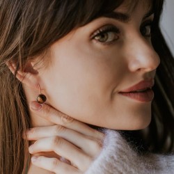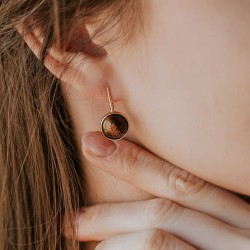 Kolczyki wiszące wykonane ze srebra pozłacanego, w których osadzono naturalne tygrysie oko. Kamień w ciepłych, brązowo-złotych odcieniach pięknie mieni się w świetle, tworząc charakterystyczny „koci” refleks. Prosta, okrągła oprawa podkreśla naturalne piękno minerału i sprawia, że kolczyki są subtelne, a zarazem wyraziste – idealne zarówno na co dzień, jak i do eleganckich stylizacji.