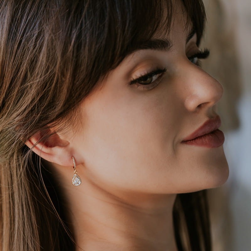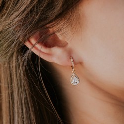 Wiszące kolczyki z cyrkoniami. Centralną ozdobą jest cyrkonia w kształcie łezki, otoczona drobnymi, błyszczącymi kamyczkami. Cała biżuteria wykonana jest ze srebra pokrytego złotem, co nadaje jej eleganckiego charakteru. To stylowa biżuteria, idealna na uroczyste wyjścia i momenty, w których chcesz poczuć się wyjątkowo.