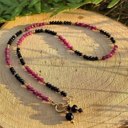Unikatowy naszyjnik z naturalnych kamieni, wykonany z turmalinu, rubinu i hematytu, oprawionych w srebro pozłacane. Całość zdobi ozdobne zapięcie oraz zawieszka z turmalinem, która podkreśla charakter biżuterii.