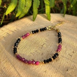 Bransoletka wykonana z naturalnych kamieni – turmalinu, rubinu i hematytu – oprawionych w srebro pozłacane. To subtelny, a zarazem pełen energii dodatek, idealnie komponujący się z naszyjnikiem z tej samej kolekcji.