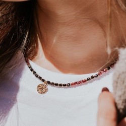 Naszyjnik ASTRA to połączenie elegancji i niezwykłej energii ochronnej. Fasetowane kostki granatu i czarnego turmalinu zestawione z połyskiem hematytu, a całość dopełnia okrągła, młotkowana zawieszka w złoconym srebrze – symbol siły i odporności.