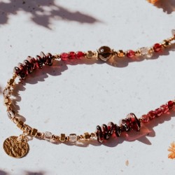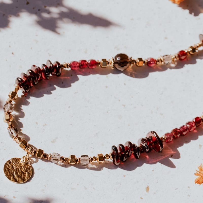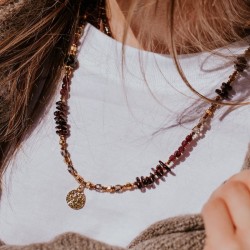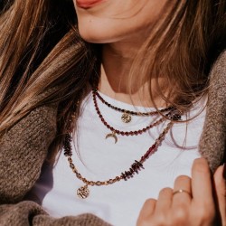 Elegancki naszyjnik MOKKA w odcieniach głębokiego borda i szarości, wykończony srebrem pozłacanym. Składa się z granatu, kwarcu dymnego i hematytu – połączenia kamieni, które harmonizują ciało i umysł.