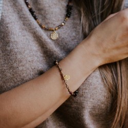 Bransoletka MOKKA z kamieni naturalnych - granatu, kwarcu dymnego i hematytu, wykończona srebrem pozłacanym.