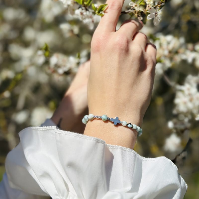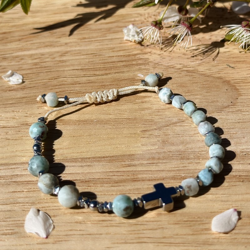 Różaniec bransoletka z kamieni naturalnych Larimar |Pierwsza Komunia Święta