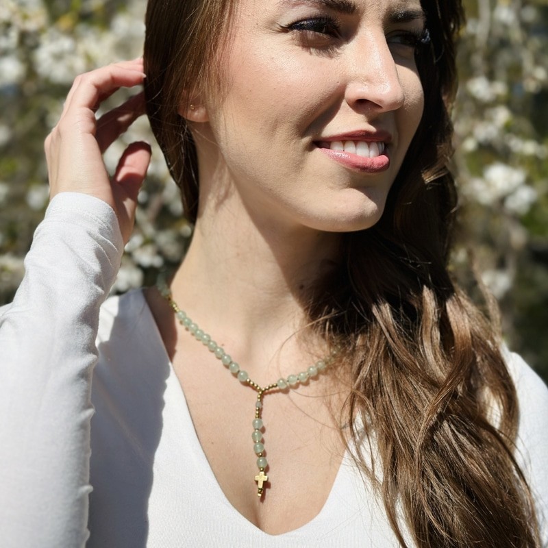 Delikatny naszyjnik wykonany z kamieni naturalnych, który łączy subtelną formę z głębokim znaczeniem duchowym. Różaniec, który dzięki swojej formie pozwala na modlitwę w każdej chwili, staje się codziennym wsparciem w przeżywaniu wiary. Doskonały jako pamiątka Pierwszej Komunii Świętej.