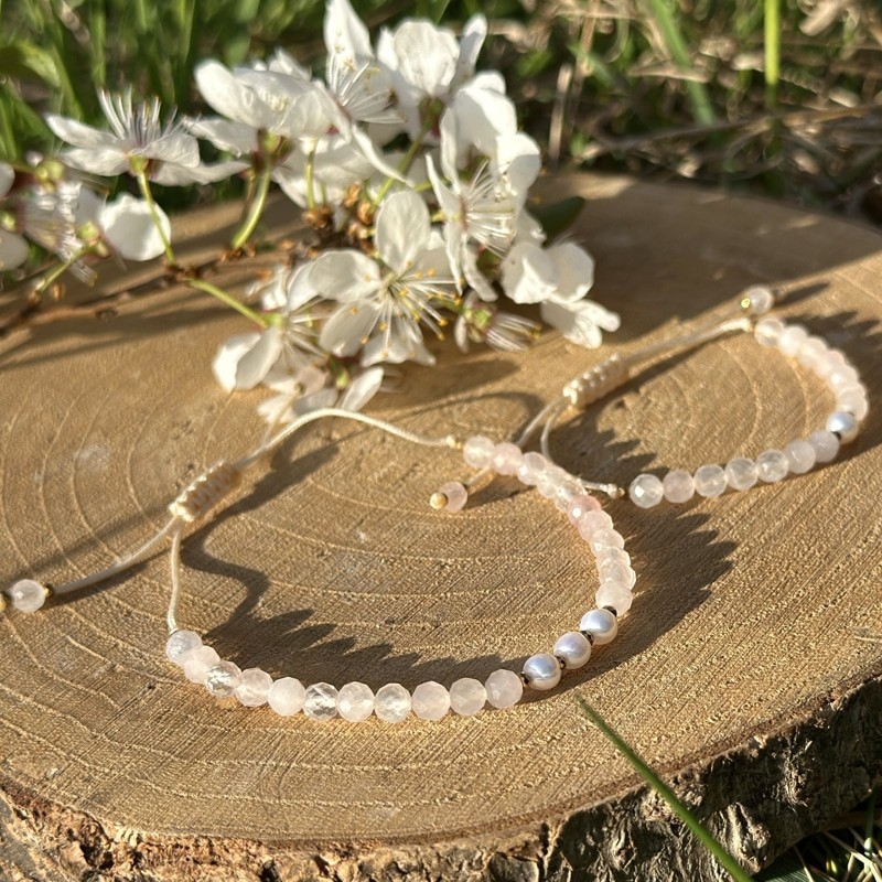 Komplet bransoletek na sznurku dla Mamy i Córki – Kwarc różowy Perły