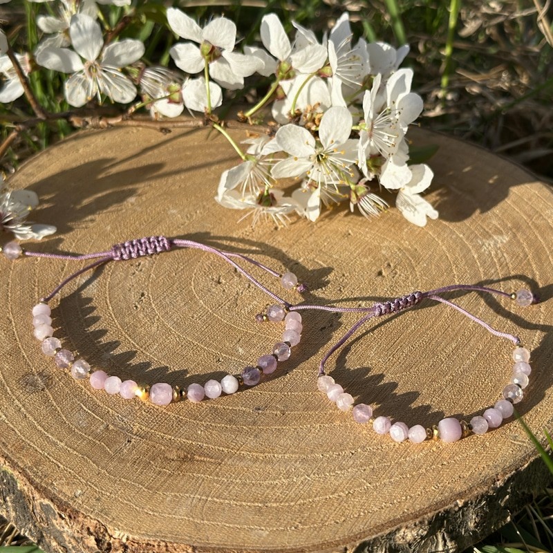 Subtelny komplet dwóch bransoletek został stworzony z myślą o wyjątkowej relacji, która łączy Mamę i Córkę. Ręcznie wykonane na delikatnym, liliowym sznurku i ozdobione naturalnym kunzytem, zachwycają lekkością oraz romantyczną kolorystyką. Biżuteria, która niesie ze sobą emocje - pełna czułości, bliskości i pięknych znaczeń.