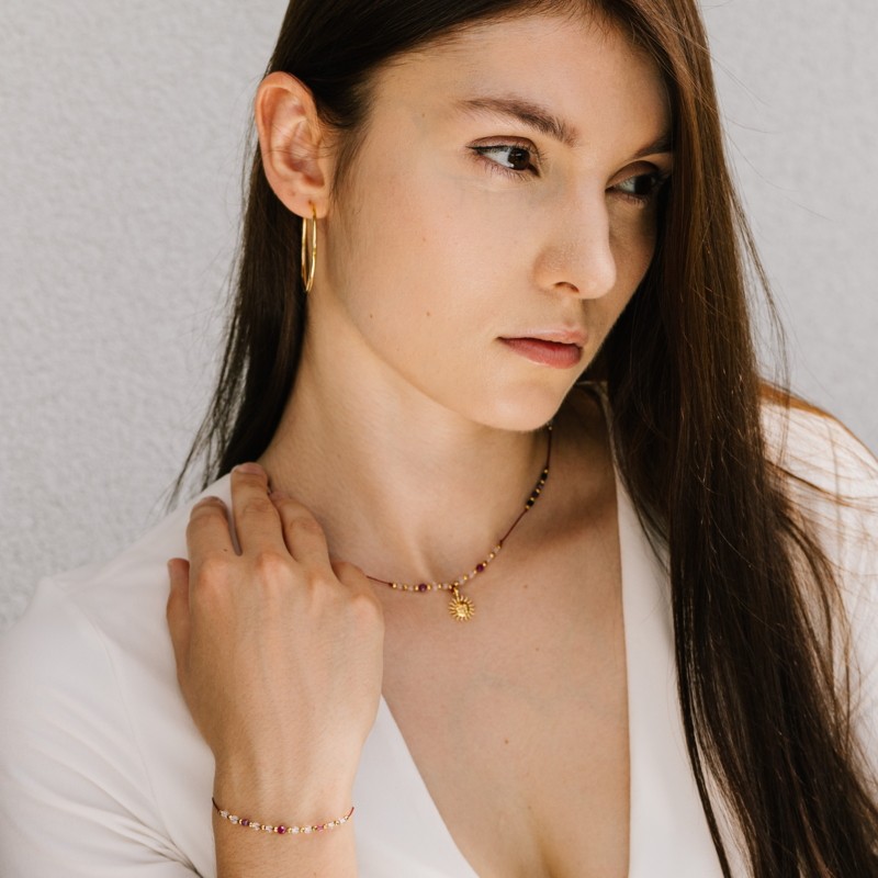 Wyrazisty naszyjnik sznurkowy z kamieni naturalnych kryształ górski i rubin to ciekawa propozycja, gdy stres nie objawia się napięciem, ale spadkiem energii. Rubin kojarzony jest z siłą życiową i odwagą, a kryształ górski wspiera klarowność.