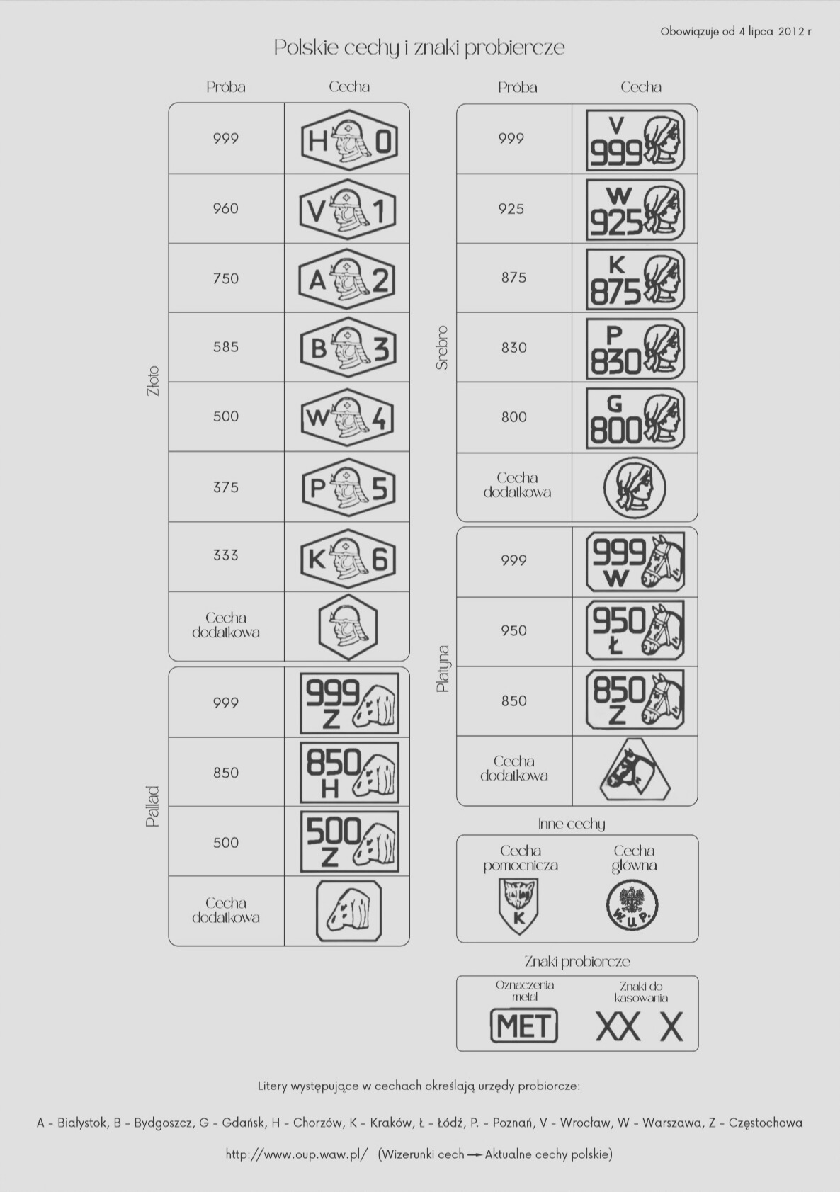Litery w cechach probierczych odnoszą się do miasta, w którym dokonano badania i ocechowania biżuterii. Oto lista oznaczeń miast w Polsce: